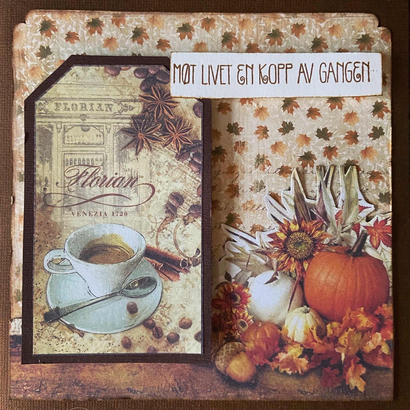 Tidligere i høst var jeg på kortlagingshelg med to venninner, og da lagde jeg bl.a. et høstkort med innslag av gresskar og kaffekopp - komplett med sitatet «Møt livet en kopp av gangen». Kan brukes både som høstkort og Halloween-kort, alt ettersom det passer. Her har jeg brukt et par restepapirer lagt lag på lag, pluss et utklippsark med kaffemotiv. Stempelet er fra en samling kaffe- og testempler fra Kort & Godt.